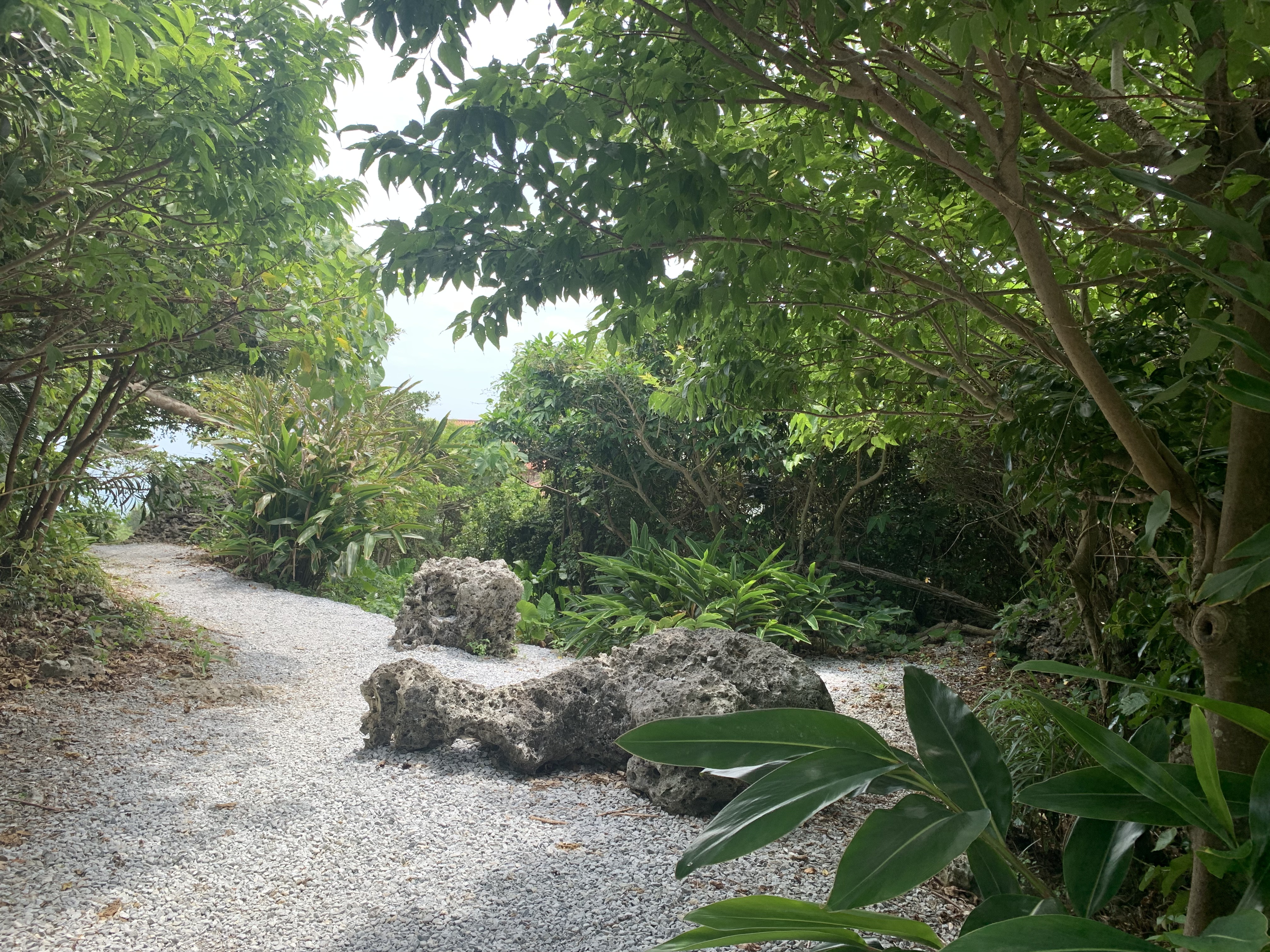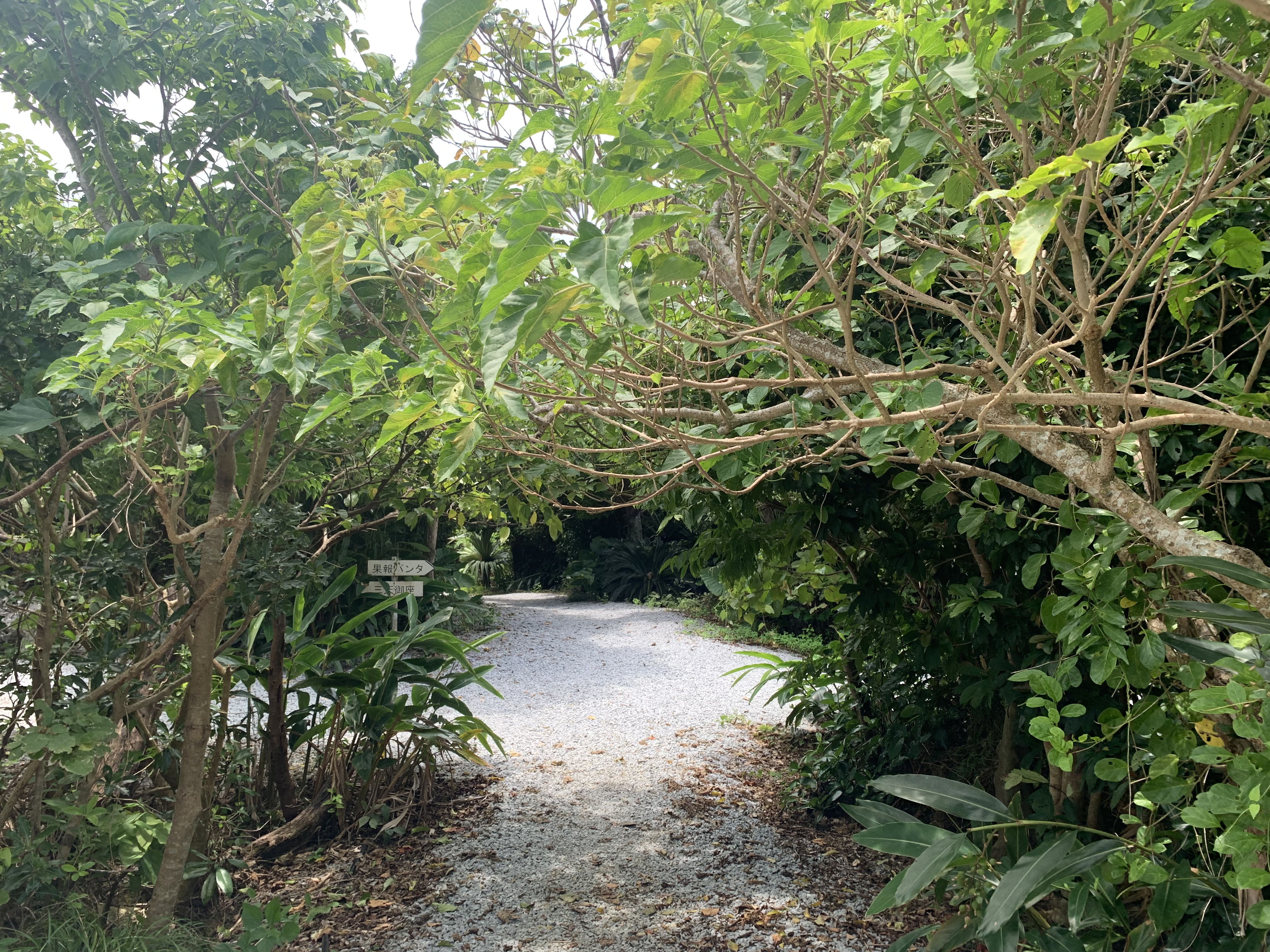 カフウバンタに行くには、隣接しているぬちまーす観光製塩ファクトリーの駐車場を利用すると便利です。写真右奥の道からバンタへ向かうことができます。先程の写真のように階段があるのでベビーカーではなく抱っこ紐で行くことをおすすめします。